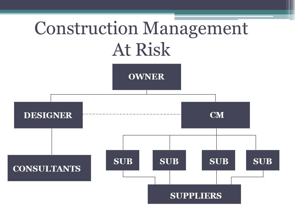 Quản lý rủi ro dự án xây dựng có nguy cơ là một cách tiếp cận, trong đó một công ty quản lý xây dựng đóng vai trò là nhà tư vấn của chủ sở hữu trong giai đoạn tiền phát triển của dự án. Trong quá trình này, chủ sở hữu của dự án sẽ dựa vào quản lý rủi ro dự án xây dựng, do đó, các hợp đồng được ký với nhiều nhà thầu phụ và được thừa nhận là điểm chịu trách nhiệm duy nhất cho việc giao dự án.