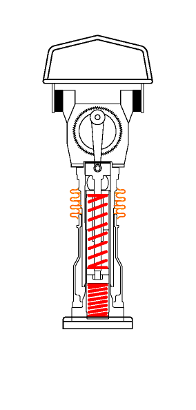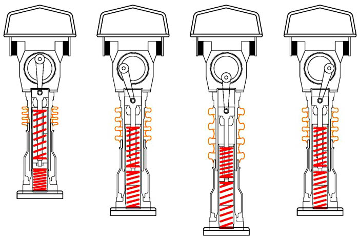 - Các mô-men xoắn hoạt động các vòng quay được tạo ra từ động cơ xăng hoặc động cơ điện được chuyển giao cho chuyển động qua lại bởi bánh răng quây, mà sẽ vượt qua nó trên chân rung (giày) thông qua xi lanh mùa xuân.